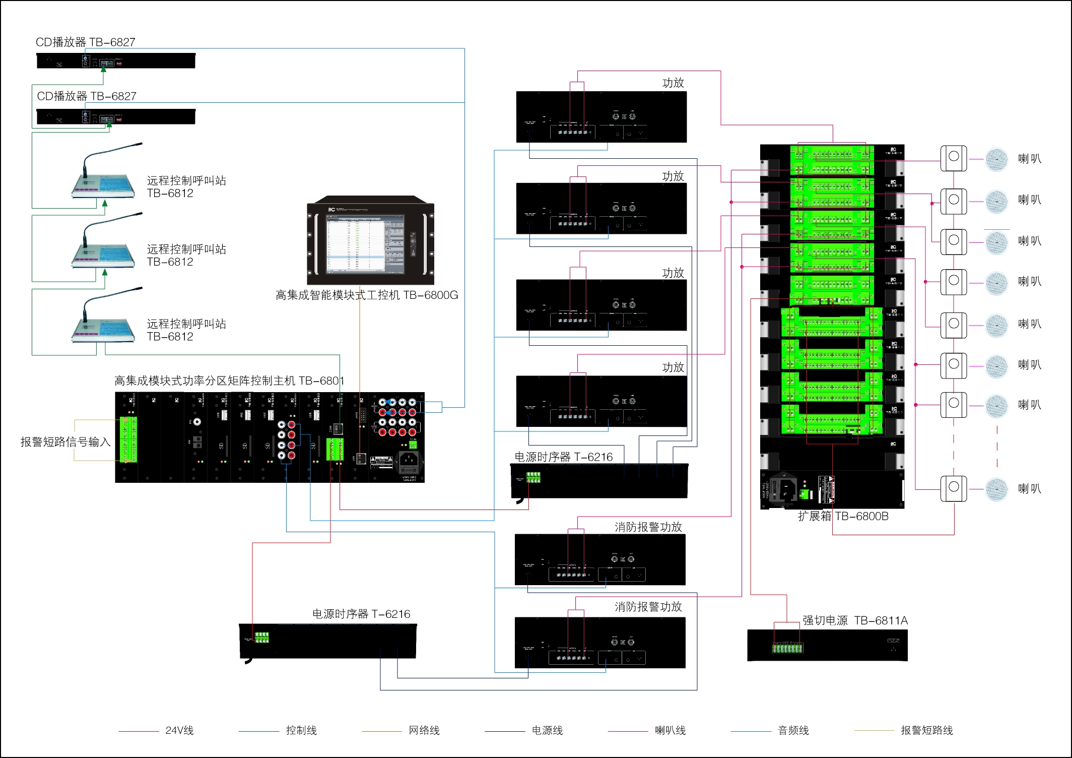公共广播系统为宾馆、商厦、港口、机场、地铁、学校提供背景音乐和广播节目。近几年来,公共广播系统还兼做紧急广播,可与消防报警系统联动。公共广播系统的控制功能较多。如选区广播与全呼广播功能、强制功换功能和优先广播权功能等。扬声器负载多而分散、传输线路长。为减少传输线路损耗,一般都采用70V或100V定电压高阻抗输送。声压要求不高,音质以中音和中高音为主。