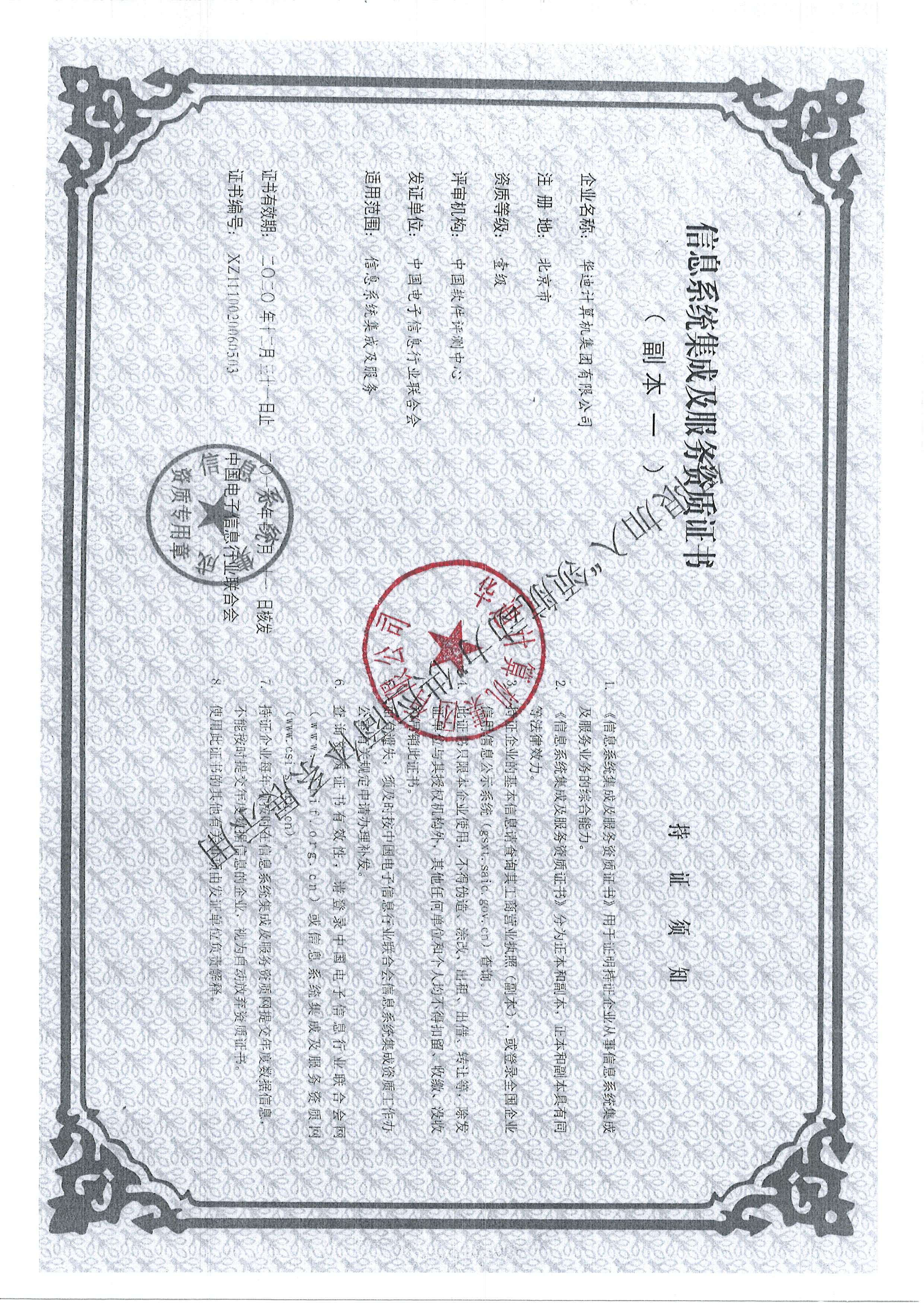 系统集成一级、涉密系统集成甲级、安防一级、智能化建筑二级等