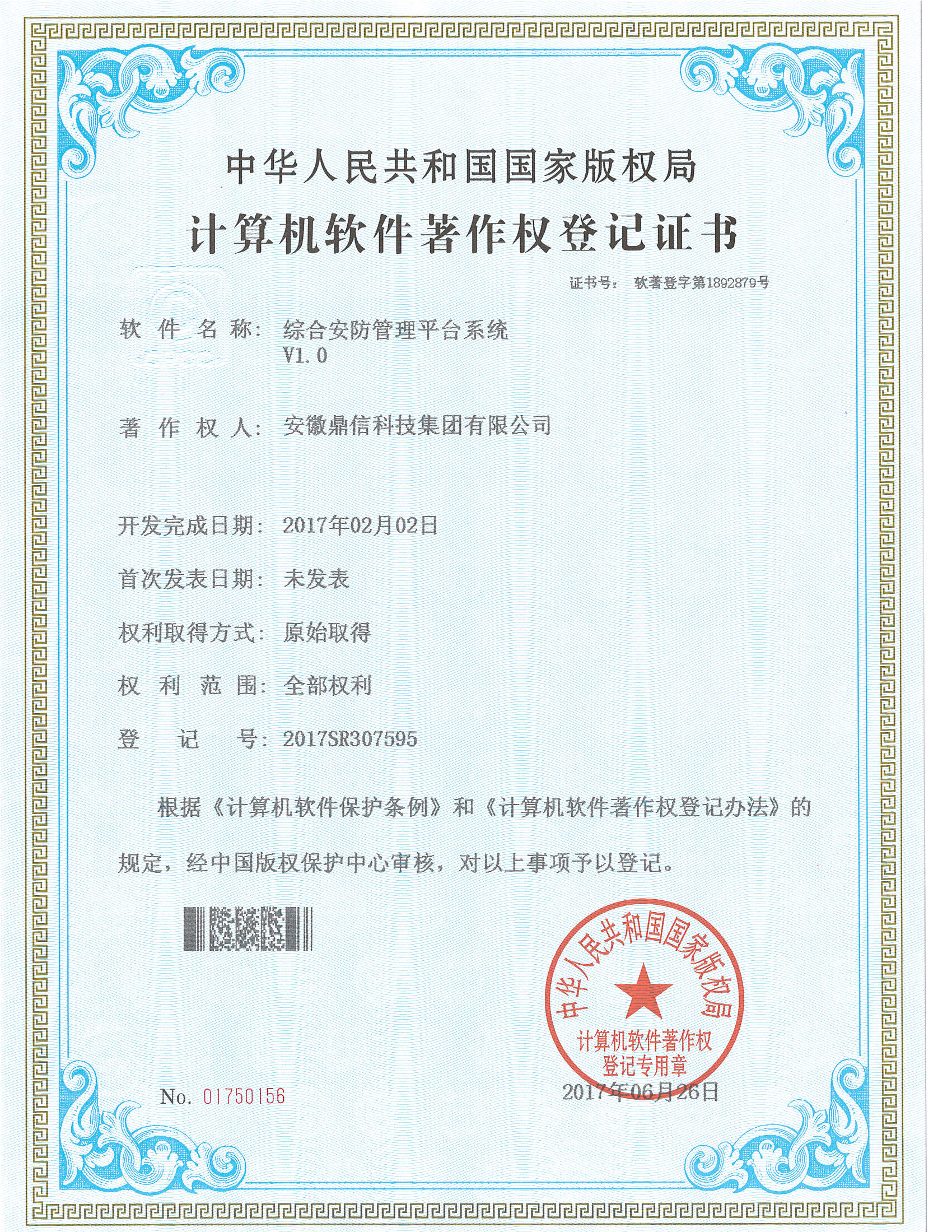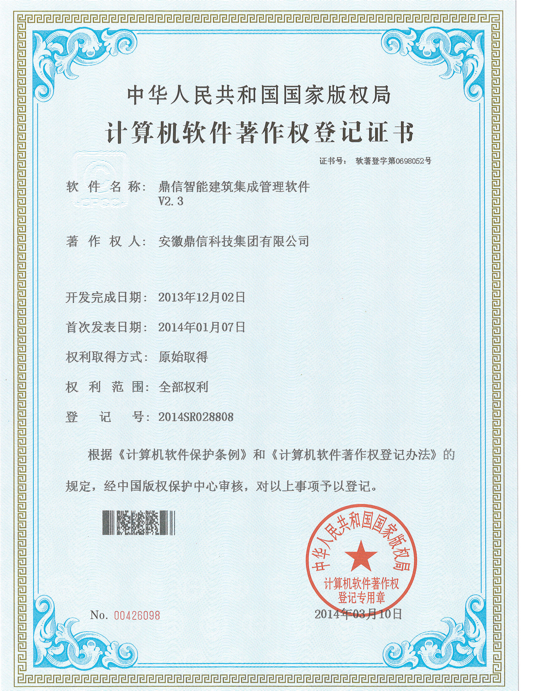 由于良好的管理和卓越的信誉,先后被评为AAA 级信用企业,合肥市科技创新培育计划企业、徽商银行“小巨人”企业等称号;连续八年荣获安徽省“重合同守信用企业”的光荣称号;2002 年即通过了ISO9000 质量管理体系认证、高新技术企业认证、双软认证企业及多项国家及省市级专利技术和荣誉;同时,还拥有建筑智能化设计与施工一级资质、建筑装饰装修工程设计与施工贰级资质、消防设施工程设计与施工贰级质、涉及国家秘密的计算机系统集成资质、安全防范壹级资质、人民防空信息系统建设保密项目设计施工单位资质、计算机信息系统集成企业资质、声频工程企业综合技术等级证书、安全生产许可证等证书。