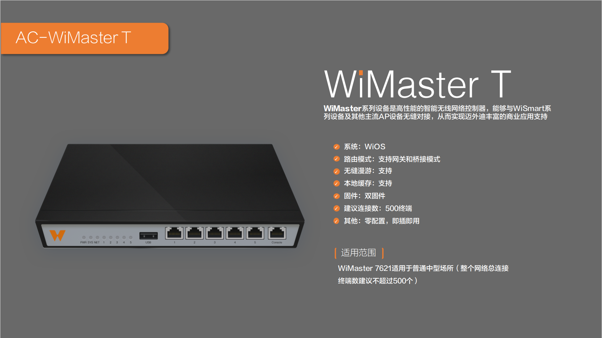WiMasterT 智能无线控制器,提供无线路由器的集中管理功能。含1个千兆WAN口、3个千兆LAN口,1个管理端口,包含50个AP管理授权。适用于中小场景的多业务认证审计设备。迈智控WiMaster是一款基于迈外迪自研WiOS系统的认证审计设备,结合迈外迪云平台,实现AP集中管理、终端认证管理、网监审计合规。