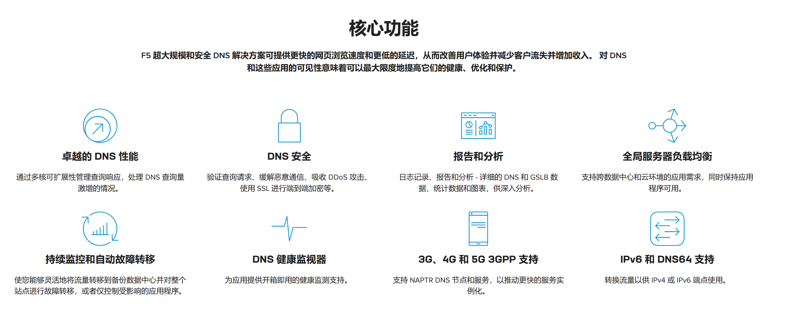 核心功能:F5 超大规模和安全 DNS 解决方案可提供更快的网页浏览速度和更低的延迟,从而改善用户体验并减少客户流失并增加收入。 对 DNS 和这些应用的可见性意味着可以最大限度地提高它们的健康、优化和保护。