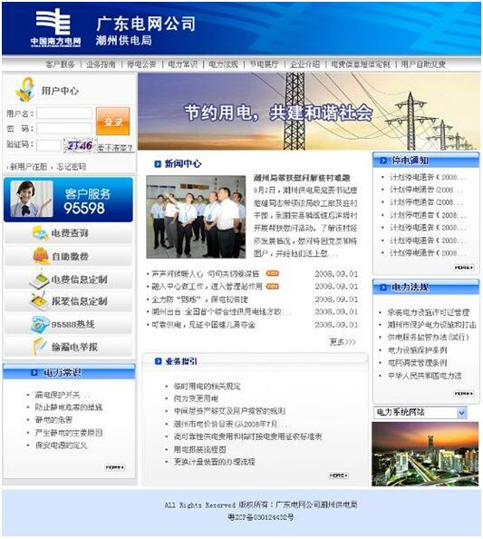 网站整体为标题型框架设有:客户服务、业务指南、停电公告、电力常识、电力法规、节电展厅、企业介绍、电费信息短信定制、用户自助交费。