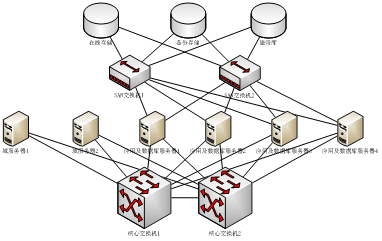 为了满足服务器24小时不间断性运行的要求,我们的网络方案为冗余多机群集方案。我们在中心配置两台域服务器(双机群集)、四台应用及数据库服务器(四机群集)、两台SAN交换机(双机容错)、一台在线存储作为一级存储、配置一台备份存储作为一级备份、配置一台磁带库作为二级备份。