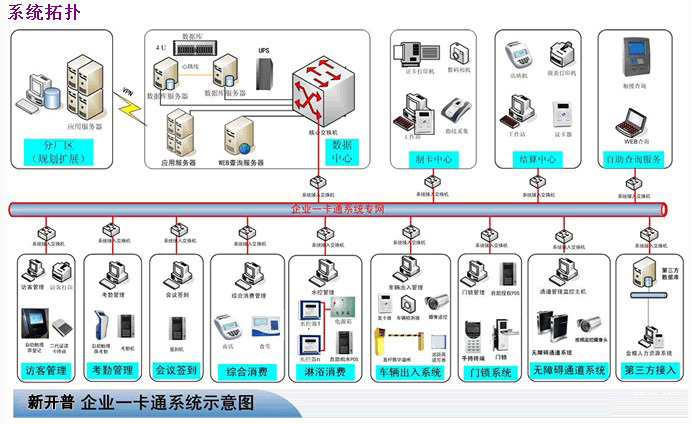 企业一卡通系统最根本的需求是“信息共享,控制集中”,为企业提供一种有效、便捷的管理手段;企业一卡通是针对企业使用证件繁多、管理复杂的情况而设计,其目标是用一张智能卡实现门禁、考勤、售饭、会议记录、车辆出入管理、企业班车、用水用电管理、培训登记、后勤管理等功能,方便员工的工作生活,并将现代化科技理念融入企业管理之中,实现“一卡在手,企业通行”。该系统覆盖考勤管理;门禁管理;餐厅消费、购物、社区服务管理、停车场管理、班车管理;水控管理和企业网管理中心等部分。其中包括人力资源管理系统、考勤管理系统、综合消费系统、工资管理系统、仓库管理系统、巡更系统、访客系统等多个应用子系统组成。