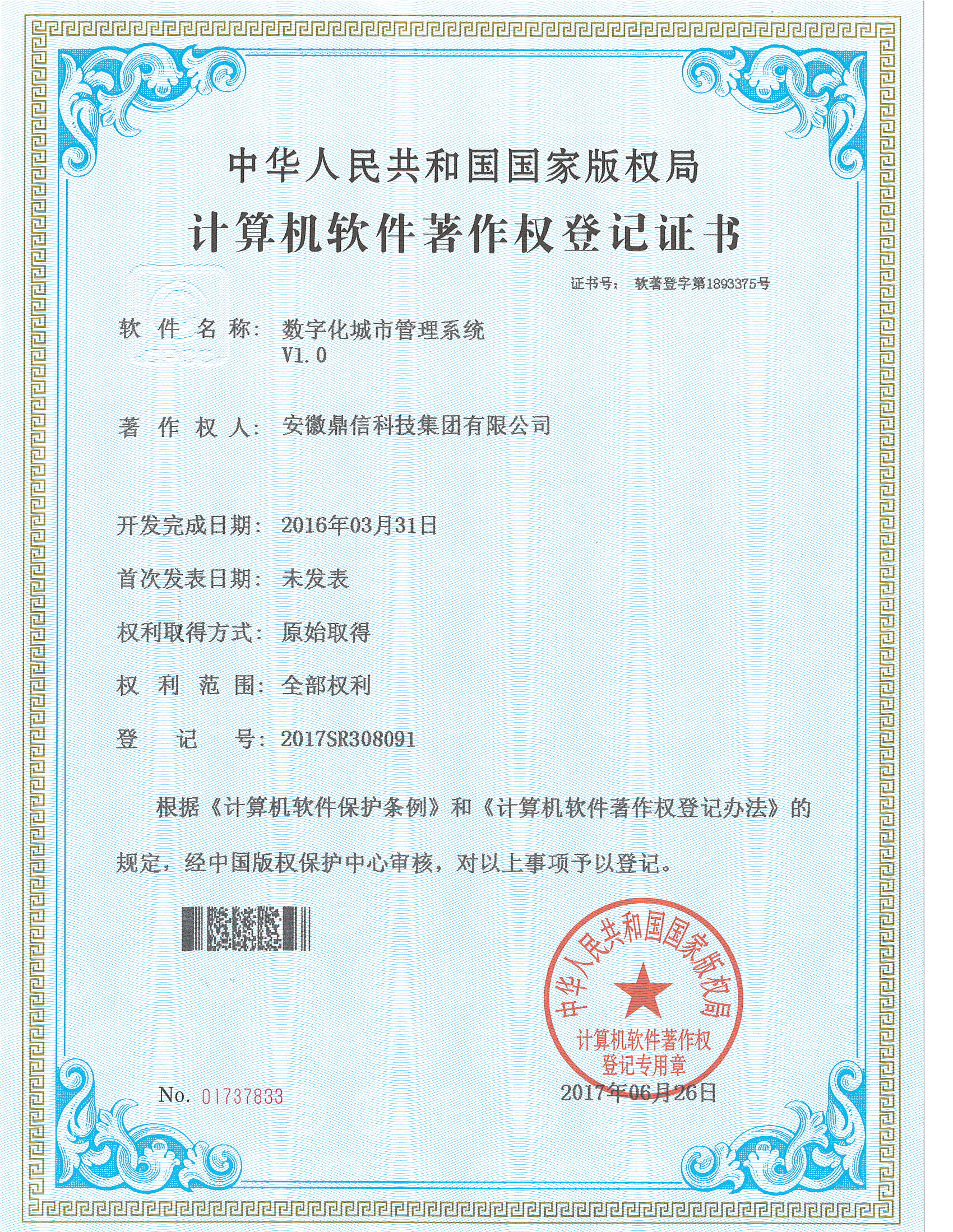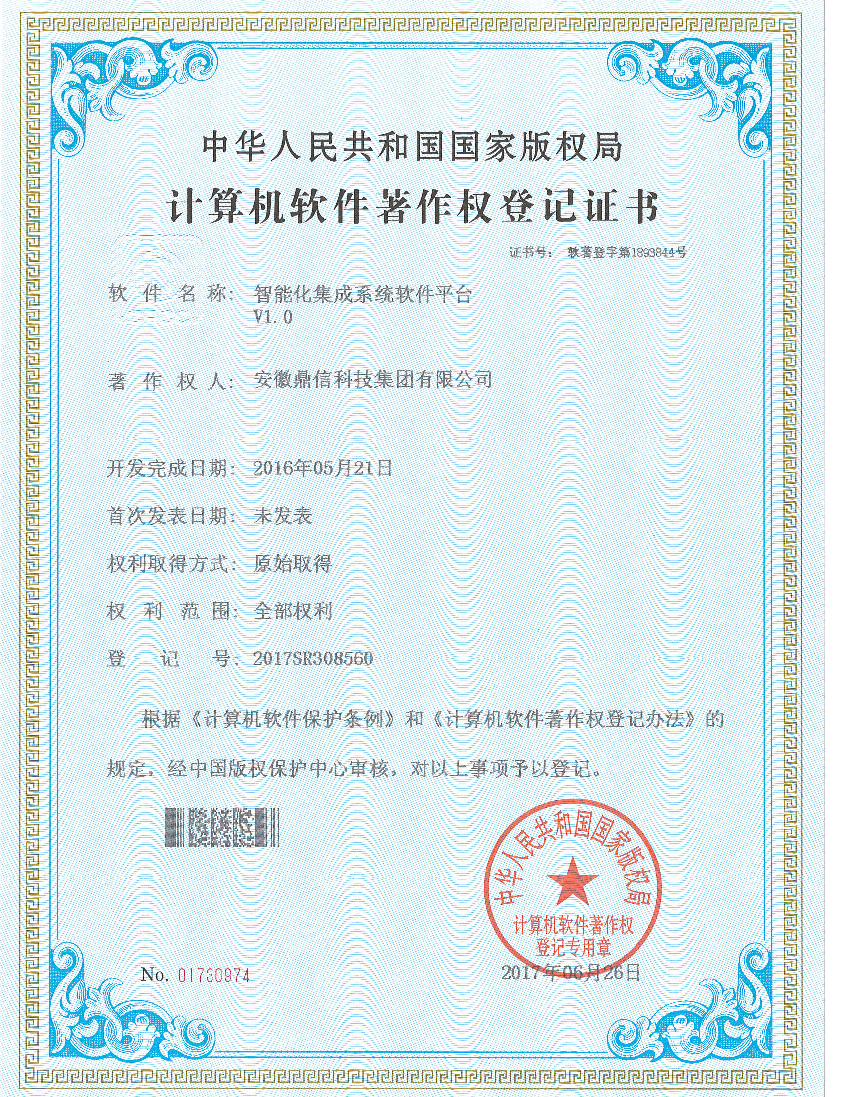 由于良好的管理和卓越的信誉,先后被评为AAA 级信用企业,合肥市科技创新培育计划企业、徽商银行“小巨人”企业等称号;连续八年荣获安徽省“重合同守信用企业”的光荣称号;2002 年即通过了ISO9000 质量管理体系认证、高新技术企业认证、双软认证企业及多项国家及省市级专利技术和荣誉;同时,还拥有建筑智能化设计与施工一级资质、建筑装饰装修工程设计与施工贰级资质、消防设施工程设计与施工贰级质、涉及国家秘密的计算机系统集成资质、安全防范壹级资质、人民防空信息系统建设保密项目设计施工单位资质、计算机信息系统集成企业资质、声频工程企业综合技术等级证书、安全生产许可证等证书。